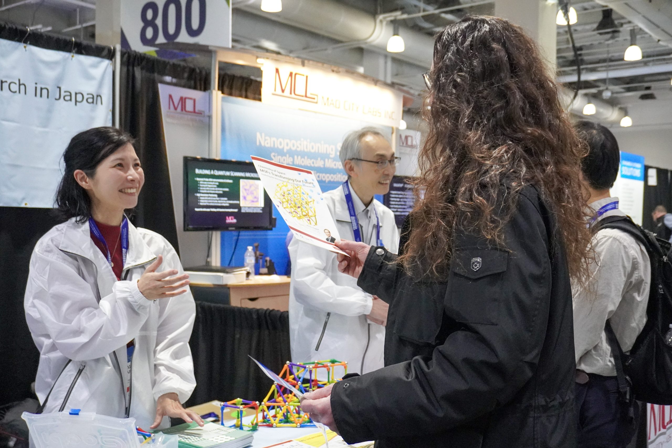 This booth was a collaborative effort involving staff from Kyoto University iCeMS, Tohoku University's WPI-AIMR, and the WPI Program Division of the Japan Society for the Promotion of Science (JSPS), with support from the JSPS Washington Office.