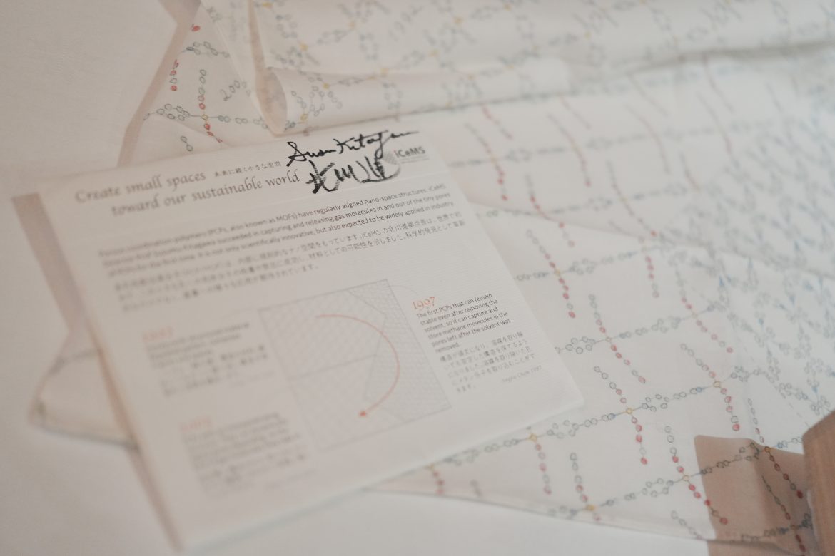 The donation also includes a handkerchief featuring MOF structures which was planned and designed by Associate Professor Mari Toyama and Assistant Professor Mindy Takamiya of the iCeMS' Communications Design Unit. It features artistic renderings of the 1992, 1997, and 2003 MOF structures in a soft, approachable touch.