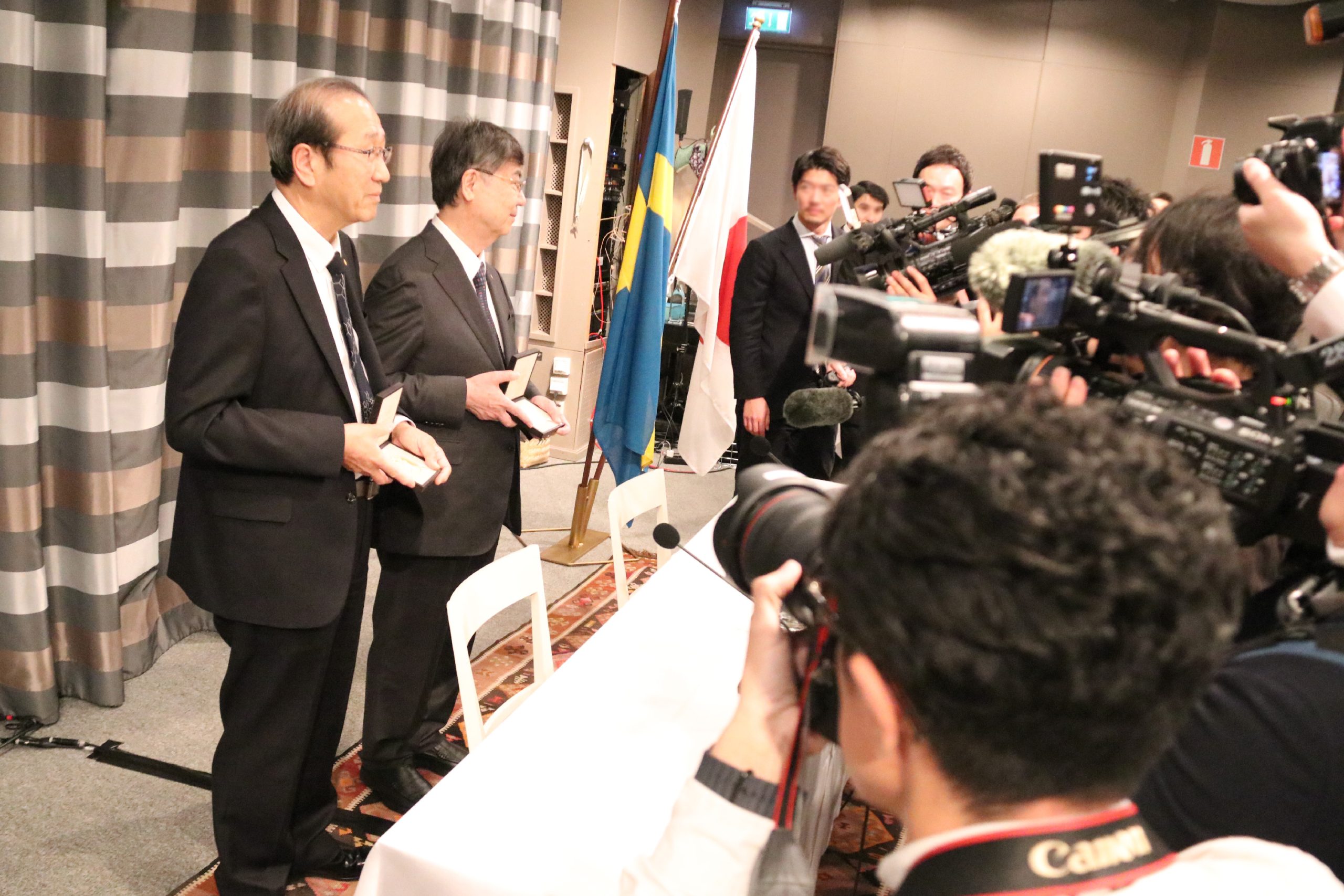12月11日、ストックホルム市内において、在スウェーデン日本国大使館主催の合同記者会見が行われ、今年ノーベル化学賞を受賞したアイセムスの北川進特別教授と、ノーベル医学・生理学賞を受賞した、大阪大学の坂口志文特別栄誉教授が出席しました。